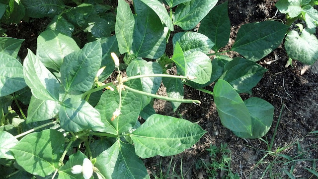 The beans are climbing....anything they want. They are training nicely up the strings, but are also climbing up the center pole AND reaching backwards for the fence....which is NOT a good idea with this fence.