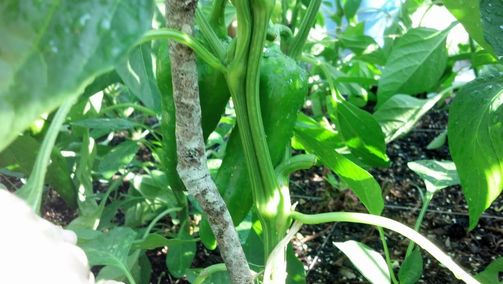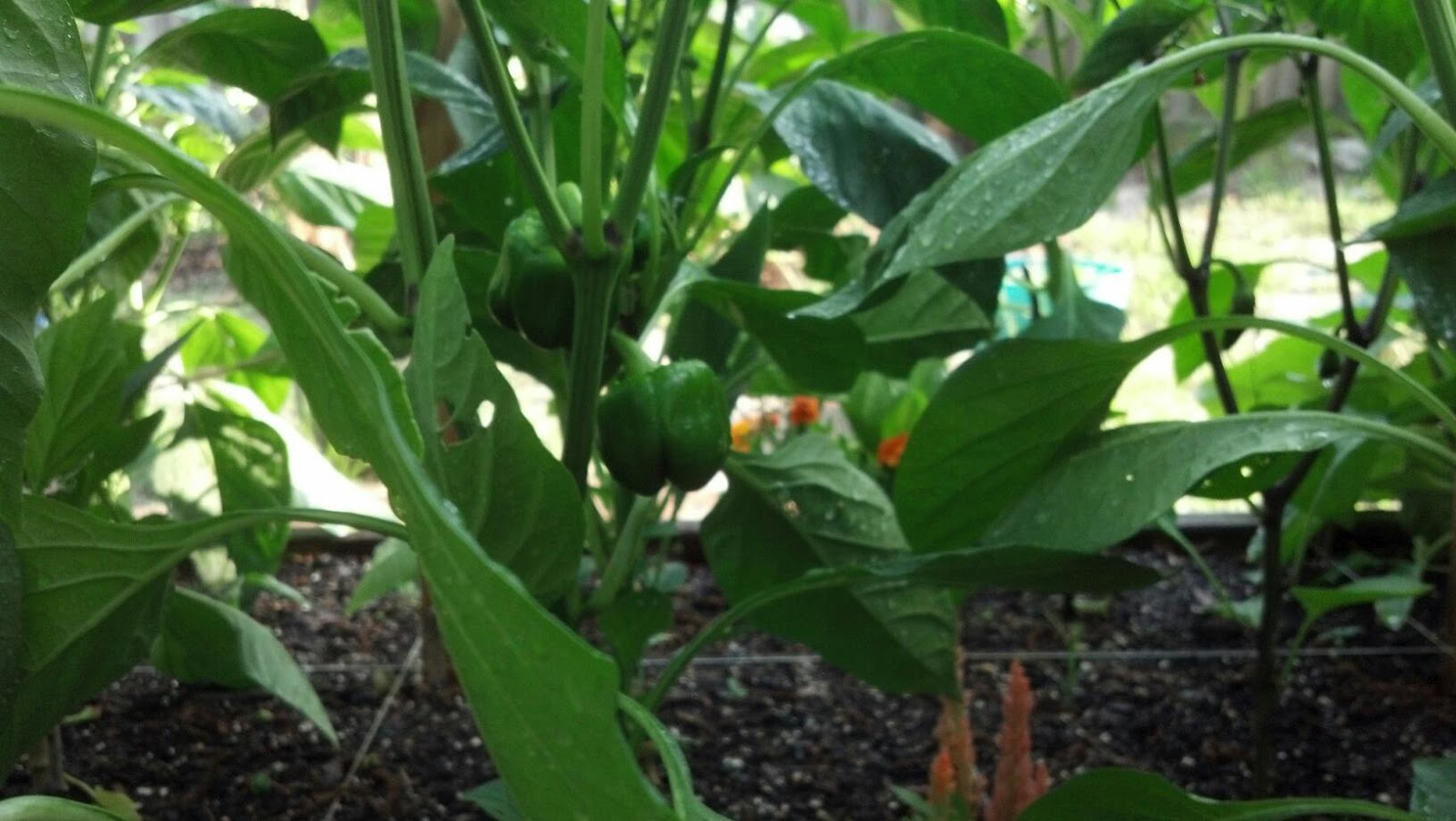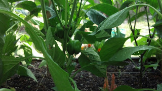 Here's some more bell peppers. My DH started the garden from seeds this year and at one point in time there was a "spill" and some of the plants identities became a mystery. We marked these in the garden with a popsicle stick with a big ?