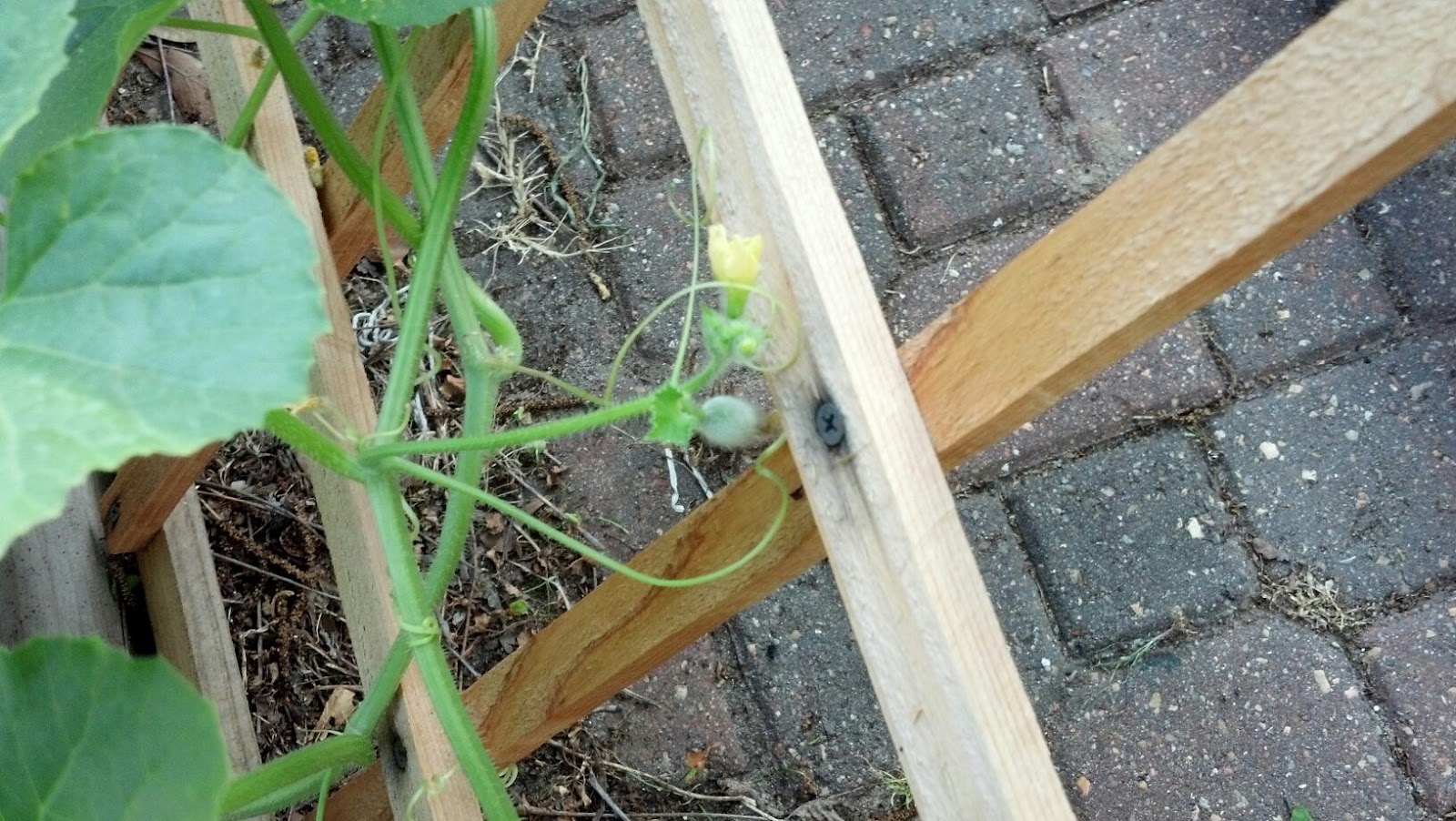 The melon trellis is slowly but surely getting taken over by the watermelons and cantaloupes. The cantaloupe on the far right side decided it wanted to head to the left instead of straight up so it is crawling all over the other plants sideways. They don't seem affected for now, and it is pretty determined to stay that way too.